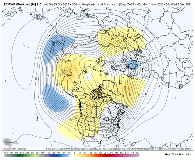 The established major warmth over central North America to start October has been undercut as we thought as the jet in the Pacific is slamming into the Northwest. Then, it will send energy into the southern Plains. We did not see a named tropical storm but what is slamming New England is an example of what that warm water can do. Since the northwestern Atlantic is so warm, it is more than happy to contribute to the ridging. So this will continue to work its way to the northeast, and once over northeastern Canada and Greenland, the trough can run rampant underneath. Then whether cold air can be delivered over the U.S. becomes a matter or source-regions of the air masses. The threat of early severe cold relative to averages remains and we are pointing at the Thanksgiving to New Years’ period as the coldest of what is now a more obvious forecasted colder turn starting.