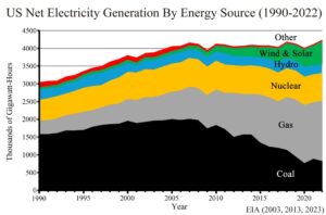 In 2022, 60 percent of US electric power was generated by coal and natural gas. About 85 percent came from the traditional generators: gas (40%), coal (20%), nuclear (18%), and hydroelectric (6%). After two decades of subsidies, wind and solar provided only about 15 percent of US electricity.