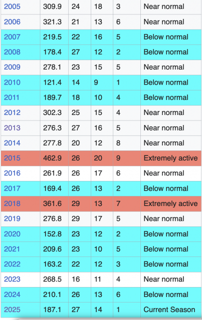 Tropical cyclones have become a pawn in the man-made climate change game. If you ever want to gauge deception and ignorance as a metric, you can find it here. I aim to show the GLOBAL reality of this season in the tropics to counter the propaganda — sadly, on both sides, much more though on the alarmist side. President Trump did not stop the hurricanes this year, as I have seen in some social media comments. In this day and age, I can never tell who is kidding. And the lack of hurricane hits is no more a sign of climate change than years with multiple hits. I did not use “climate change” as a reason for the Dec. 7, 2023 forecast for a season from hell for the U.S. for 2024, nor was it used for this year’s much less forecast than last year (and of course it wound up well under even that idea).